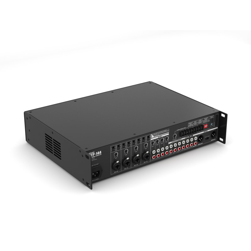 Благодаря наличию большого количества оригинальный функций и безупречному качеству, предусилитель PTP-144 поможет решить множество интеграционных задач любого уровня сложности. Предусилитель имеет два балансных (XLR) и не балансных (RCA) выхода, которые могут быть сконфигурированы как в режим стерео, так и два моно с отдельной регулировкой уровня каждого канала. CVGaudio PTP-144 имеет четыре универсальных микрофонных входа – могут использоваться как XLR, так и TRS / TR Jack 6.3mm. Для каждого из микрофонных входов есть возможность настройки чувствительности, включения фантомного питания и активации приоритета. В предусилителе предусмотрен суммарный выход со всех микрофонных входов SUM MIC OUT (без суммирования с линейными входами). Сигнал с данного выхода может быть отправлен в отдельную зону, где необходима трансляция информационных речевых сообщений без трансляции фоновой музыки, проигрываемой в основной зоне - например технические или служебные зоны торгового центра и т.д. Монофонический выход сделан на двух разъемах RCA - для единовременного подключения двух устройств. Также в CVGaudio PTP-144 имеется четыре линейных входа с индивидуальной настройкой чувствительности. Входа выполнены на разъемах 2RCA. На лицевой панели предусилителя имеется селектор для выбора линейного входа. Для ретрансляции сигнала на другие звукоусиливающие или коммутирующие устройства у каждого из линейных входов имеется сквозной выход – THROUGH OUT. Также при необходимости можно получить линейный сигнал после селектора входов используя выход AUX AFTER SELECT OUT. Для вещания аварийного сигнала в PTP-144 имеется вход Global Priority. Этот вход обладает максимальным приоритетом и при подаче на него сигнала все остальные входа приглушаются. Громкость входа GP не зависит ни от каких настроек на лицевой панели и управляется только индивидуальным регулятором на задней стороне предусилителя. Предусилитель CVGaudio PTP-144 имеет набор контактов для дистанционного управления и сопряжения с различными внешними устройствами (пожарными системами, системами автоматизации и так далее). MUSIC EXT.MUTE – контакты при замыкание которых приглушаются все AUX входа. EXT.GP.MUTE – контакты при замыкание которых приглушаются все AUX и микрофонные входа на предусилителе. 24V/0.6A – контакты на которые выводится 24V при активации выбранного приоритета в PTP-144. Выбор управляющего приоритета осуществляется с помощью микро-селектора на задней стороне устройства. Доступны следующие позиции: при наличие сигнала на контактах GP, при закрытых контактах MUSIC. EXT.MUTE и EXT.GP.MUTE, а также активных приоритетах на любом из микрофонных входов. Предусилитель имеет металлический корпус стандартной высотой 2U, кронштейны для установки в монтажную стойку входят в комплект поставки.