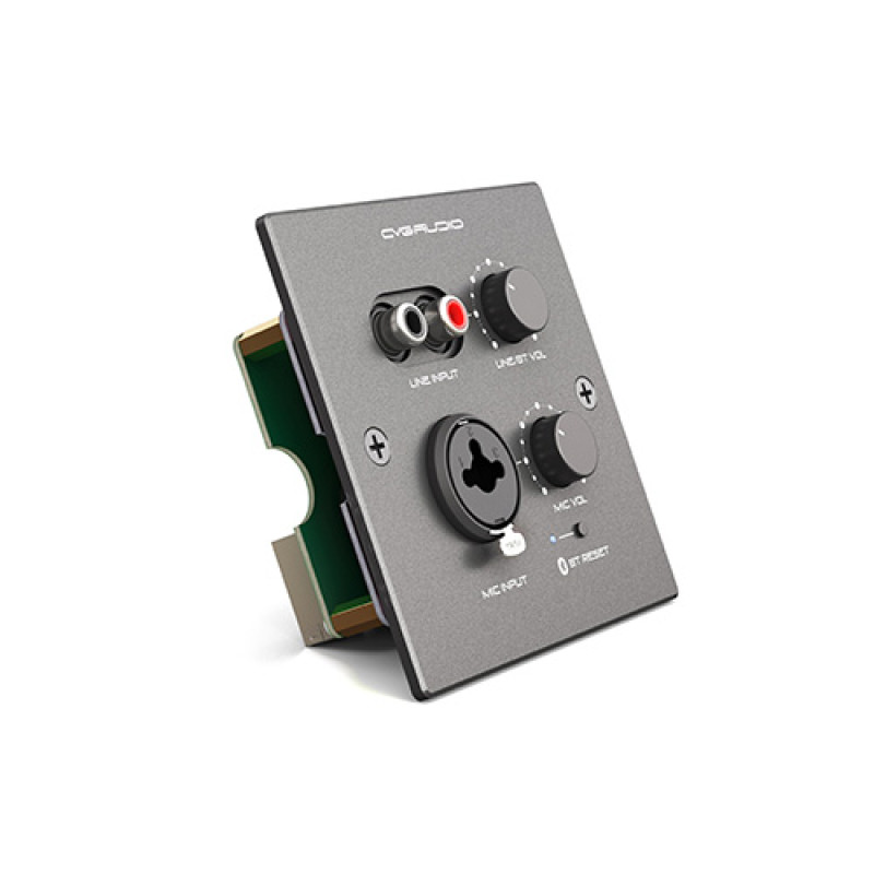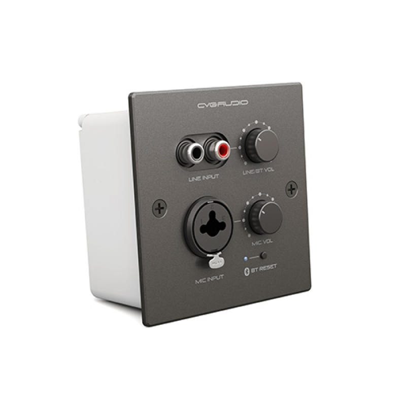 Панель оснащена двумя входами на лицевой части: линейный, небалансный, разъем 2RCA и микрофонный, балансный, универсальный разъем XLR/TRS. Входы дублируются коннекторами 2х EuroBlock 3-pin, которые расположены на задней части устройства с целью скрытого подключения в случае необходимости. Предусмотрен еще один способ подключения источника, а именно, беспроводной, за счет встроенного модуля Bluetooth (версия 5.1, антенна-стикер, дальность до 10м при прямой видимости). При его использовании источником становится любой мобильный гаджет. Аудиовыходы для передачи суммарного балансного моно или стерео-сигнала. Для управления громкостью есть два независимых регулятора.