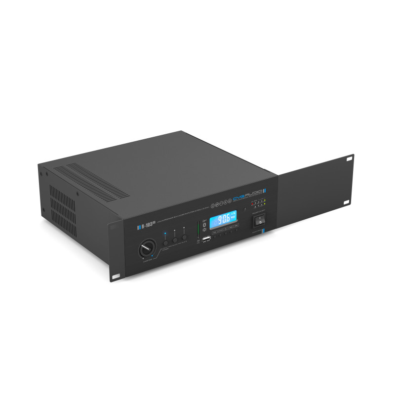 Мощность усилителя 2х50W при нагрузке 8ohm и 2х75W при нагрузке 4ohm. Корректный диапазон сопротивления нагрузки для данной модели от 4 ohm до 8ohm. Усилитель может работать в трёх режимах – stereo/parallel/bridge. В режиме Bridge сопротивление нагрузки должно быть не меньше 8ohm, при этом мощность его будет 150W. Усилитель имеет три линейных не балансных входа на разъемах 2RCA с селектором выбора активного входа (по умолчанию при включении активный – Aux in 1. Для каждого входа предусмотрена индивидуальная настройка чувствительности и общих на линейные входы двухполосный эквалайзер. В усилитель встроен источник сигнала, включающий в себя плеер USB/SD поддерживающий форматы mp3/wma/flac, FM тюнер с памятью на 20 станций и Bluetooth модуль для подключения внешних активных устройств. Вход усилителя Aux 1 в R-103m подключается через встроенный плеер. Таким образом если в режиме Aux in вставить в плеер флешку или SDcard входящий сигнал с AUX 1 отключится и начнется проигрывание файлов с подключенного флешь накопителя. Входа AUX 2 и 3 не коммутируются через встроенный плеер. Также есть один микрофонный вход XLR/TRS с возможностью включения фантомного питания, активацией приоритета над другими линейными входами и встроенным источником сигнала, а также отдельным от линейных входов двухполосным эквалайзером. На лицевую панель усилителя вынесена кнопка включения, три кнопки выбора линейного вход со светодиодной индикацией и регулятор общей громкости Master. Все прочие регуляторы управления (за исключением кнопок управления плеером) вынесены на заднюю панель для предотвращения не санкционированного или случайного изменения тонких настроек усилителя. Для подключения внешних активных звуковых устройств в усилителе предусмотрены выходы – Operated out после предусилителя, Link out – после селектора каналов и Through out сквозной выход с встроенного в усилитель источника сигнала или входа Aux in 1. Это позволяет решить большое количество не стандартных интеграционных задач. Все выходы выполнены на разъемах 2RCA. Для того, чтобы завязать усилитель с внешней системой аварийно-пожарного оповещения предусмотрены две пары управляющих контактов – MUSIC MUTE при замыкание которых мьютируются все линейные входа и встроенный плеер и FULL MUTE при замыкании которых мьютируются все, и линейные и микрофонные входа. CVGaudio R-103 имеет активное охлаждение. Вентилятор активируется при нагреве радиатора охлаждения транзисторов выходного каскада до температуры 55 градусов. При этом скорость его вращения увеличивается при дальнейшем нагреве радиатора. Усилитель имеет металлический миниатюрный корпус с алюминиевой лицевой панелью. Крепление в монтажную стойку приобретается отдельно. При установке в стойку усилитель займет 2U в высоту. Все усилители CVGaudio серии R гарантированно обеспечат отличное качество звучания и стабильную, бесперебойную работу в течении всего срока службы. Усилитель имеет все необходимые средства защиты - от перегрева, перегрузки, короткого замыкания, предохранитель по питанию.