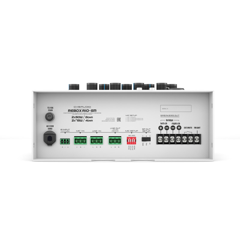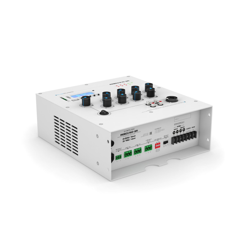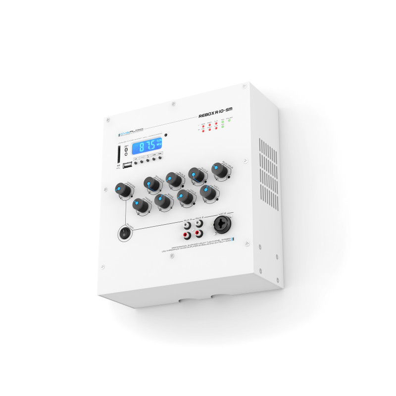 CVGaudio ReBox R10-SM - профессиональный двухканальный стереофонический микшер-усилитель для настенной установки. Данная модель отлично подойдет для организации трансляции музыки, речи, звуковых дорожек видео презентаций и прочего аудио контента в переговорных, конференц-залах, учебных классах, лекционных аудиториях, офисах, небольших магазинах, кафе и других подобных помещениях. Благодаря очень удобному форм-фактору ReBox R10-SM требует минимум места для установки - не требуется никаких полок и стоек, корпус фиксируется непосредственно на стену или на любую другую вертикальную плоскость (например, на внутреннюю сторону лекторской стойки, стойки бара или кассового стола в бутике). Усилитель имеет нетрадиционный для профессионального звукового оборудования, но безусловно актуальный для настенной установки – белый цвет корпуса. Материал корпуса – металл.