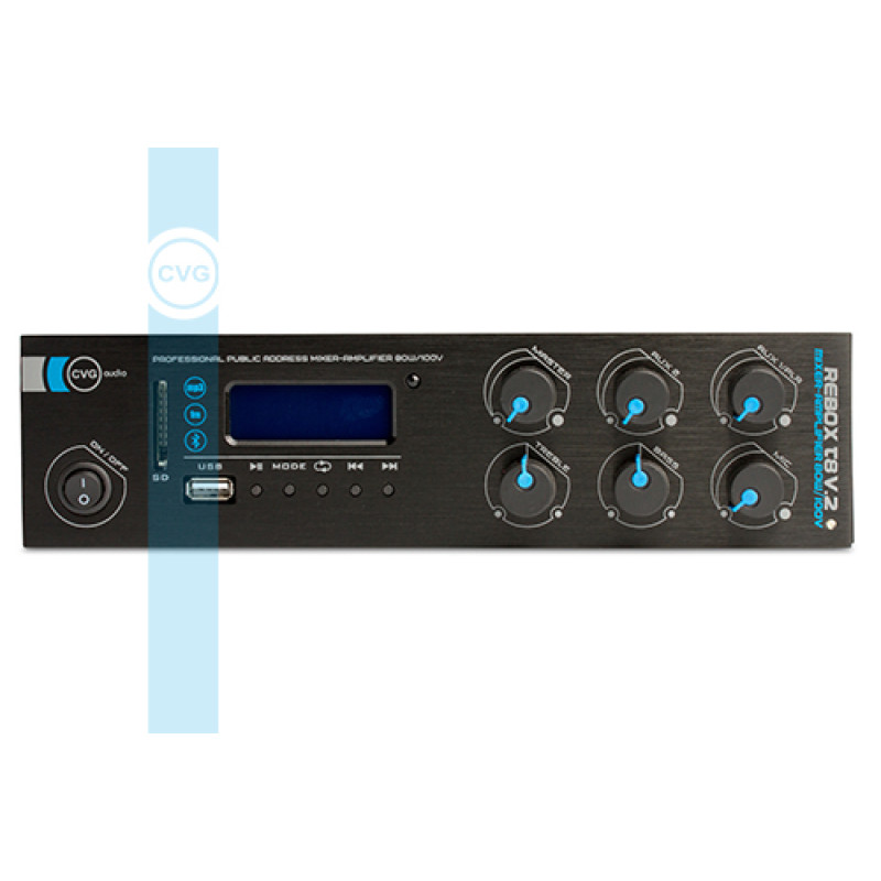 CVGaudio ReBox-T8 – Миниатюрный профессиональный микшер-усилитель с встроенным MP3 / FM / Bluetooth модулем для систем трансляции фоновой музыки и речевого оповещения. Благодаря своему миниатюрному размеру и продуманной эргономике данный усилитель является уникальным в своем формате устройством.
