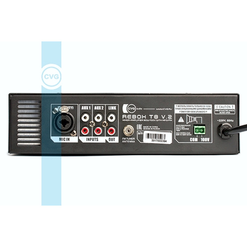 CVGaudio ReBox-T8 имеет, помимо встроенного модуля MP3/FM/Bluetooth, два линейных входа (2 x 2RCA) с индивидуальной регулировкой громкости и один микрофонный вход на универсальном разъеме XLR/TR 6.3mm. Первый Aux in совмещен с встроенным модулем источника сигнала. При включении усилителя модуль в первую очередь обращается к слотам USB/SD, если носители с треками поддерживаемых форматов (mp3 / wma) не обнаружены, переходит в режим AUX – внешнего линейного сигнала. Если обнаружены – автоматически начинает проигрывание. Для управления этим входом используется один общий с плеером регулятор громкости – Aux 1 / PLR.