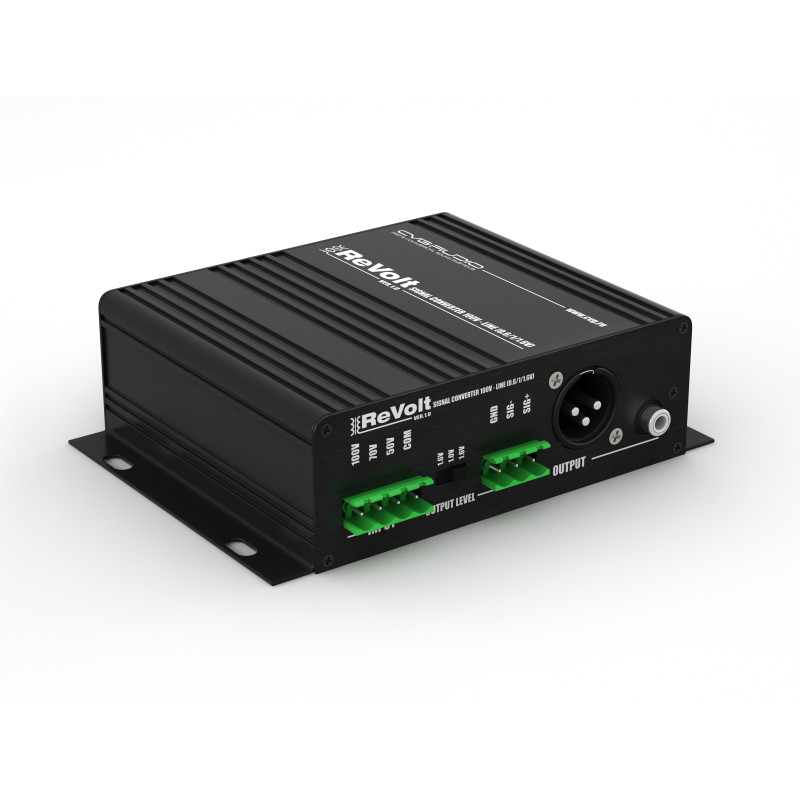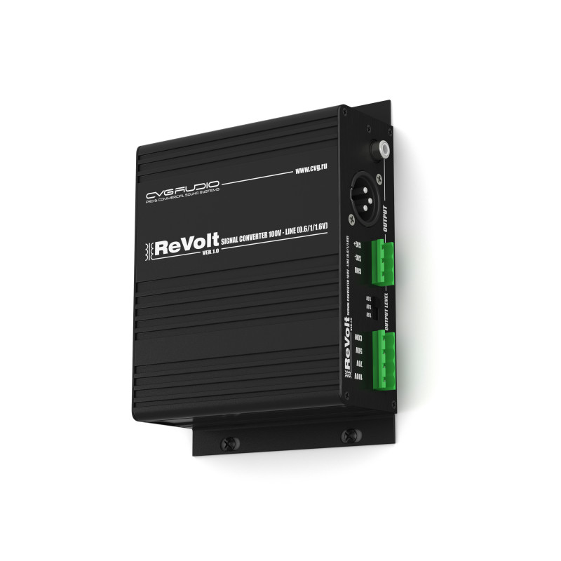 CVGAUDIO REVOLT - Одноканальный преобразователь спикерного сигнала трансляционных систем 100V/70V/50V (сигнала взятого с трансляционного громкоговорителя или со спикерного выхода трансляционного усилителя) в звуковой сигнал линейного уровня, который можно подключать на линейный вход любого активного звукового устройства: усилителя, активного сабвуфера, микшерного пульта и так далее.