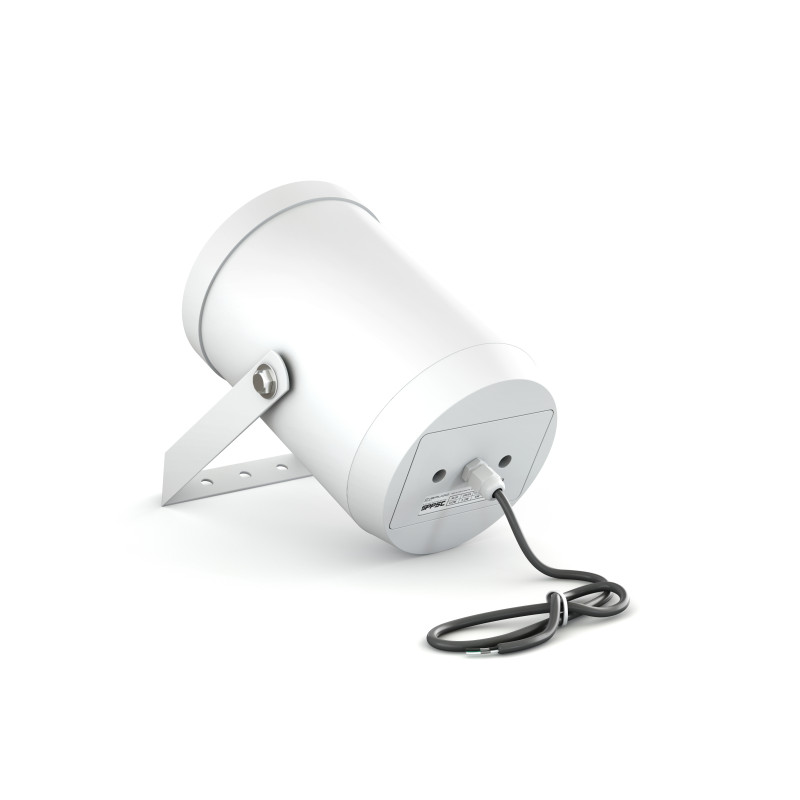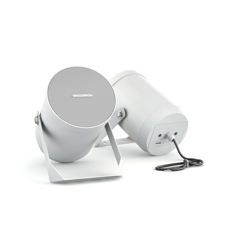 Звуковые прожекторы рекомендуется использовать для трансляции фоновой музыки, рекламных звуковых роликов и речевых сообщений, устанавливая их на фасадах торговых комплексов, вокзалах, автостоянках, парковках и других общественных помещениях и территориях, где требуется направленная передача звука и высокая разборчивость транслируемой речи. Также данная модель звукового прожектора может быть использована в качестве подвесного громкоговорителя и свешиваться с потолка (актуально для высоких потолков от 6-ти метров, например складские ангары или большие продуктовые и прочие магазины в помещениях ангарного типа). CVGaudio SPP5T имеет влаго и пылезащитный корпус (IP55) и благодаря этому, данная модель звуковой колонны может быть установлена на открытом воздухе. Герметичный корпус выполнен из ABS пластика стойкого к воздействию влаги, солнечного света и пыли. Корпуса акустической системы выпускаются только в белом цвете. Диффузор громкоговорителя закрыт защитной алюминиевой сеткой и прозрачным для звука плотным синтетическим материалом (специальный паролон), который не позволяет каплям влаги попадать на установленный внутри корпуса громкоговоритель. Декоративная алюмиениевая сетка покрашена в цвет корпуса звуковой колонны. В звуковом прожекторе используется громкоговоритель диаметром 5,25”(133.35mm) изготовленный из поолипроопилена высокой плотности. Внутри корпуса звукового прожектора установлен качественный согласующий 100V трансформатор, который позволяет подключить данную модель в 100V режиме на одну из трех доступных мощностей – 2,5W, 5W и 10W. CVGaudio SSP5T имеет выходящий из корпуса акустической системы четырехжильный кабель для подключения к спикерной линии. Кабельный выход не имеет клеммной коробки, что позволяет непосредственно подключить его к спикерной линии и при установке на улице надежно гидроизолировать. Для подключения на 2,5W используются проводники COM (черный) и 2,5W (зеленый), желтый и красный раздельно изолируются. Для подключения на 5W используются проводники COM (черный) и 5W (желтый), зеленый и красный раздельно изолируются. Для подключения на 10W используются проводники COM (черный) и 10W (красный), зеленый и желтый раздельно изолируются. Низкоомного подключения в CVGaudio SSP5T не предусмотрено. В комплекте с звуковой колонной поставляется кронштейн для установки на стену или потолок. Тщательно отобранные комплектующие и высокое качество сборки звукового прожектора CVGaudio SPP5T обеспечивают долгую и бесперебойную работу данной модели даже при установки на открытом воздухе.