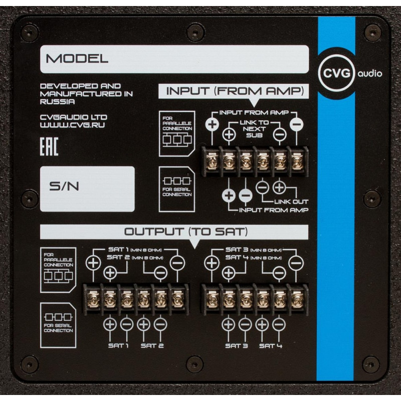 В комплект поставки сабвуфера входит удобный настенный кронштейн. При установке SUB-ONE-Bl на стену с помощью данного кронштейна расстояние от стены до задней стенки корпуса сабвуфера не будет превышать 15мм. Этого вполне достаточно чтобы вывести и подключить приходящие от усилителя спикерные кабели. Фиксация их осуществляется с помощью надежного винтового клеммного терминала. Помимо входа, модель имеет линкующие выходы для параллельного подключения второго сабвуфера. В своем классе SUBONE-Bl благодаря отличному звуку и оригинальному внешнему виду может уверенно конкурировать с продукцией именитых европейских и американских брендов при этом выгодно отличаясь от них по цене. Данная модель сабвуфера совместно с сателлитами CVGaudio SAT S3 входит в стандартный типовой комплект для систем коммерческого звука - CVGaudio SUBSET 100.