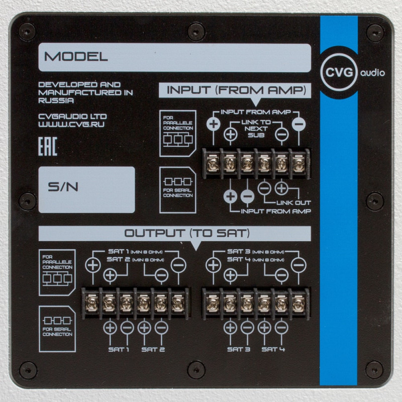 В комплект поставки сабвуфера входит удобный настенный кронштейн. При установке SUBONE-W на стену с помощью данного кронштейна расстояние от стены до задней стенки корпуса сабвуфера не будет превышать 15мм. Этого вполне достаточно чтобы вывести и подключить приходящие от усилителя спикерные кабели. Фиксация их осуществляется с помощью надежного винтового клеммного терминала. Помимо входа, модель имеет линкующие выходы для параллельного подключения второго сабвуфера. В своем классе SUBONE-W благодаря отличному звуку и оригинальному внешнему виду может уверенно конкурировать с продукцией именитых европейских и американских брендов при этом выгодно отличаясь от них по цене. Данная модель сабвуфера совместно с сателлитами CVGaudio SAT S3 входит в стандартный типовой комплект для систем коммерческого звука - CVGaudio SUBSET 100.