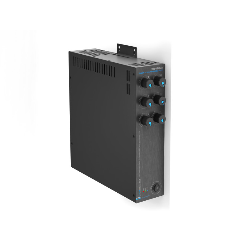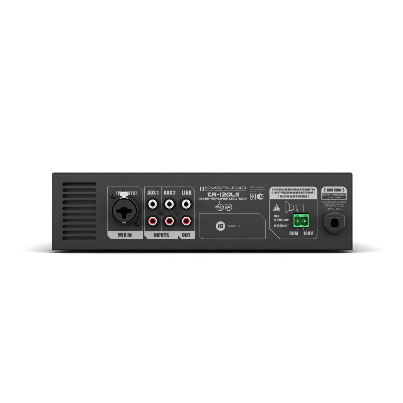 CVGaudio TR-120LS предназначен для работы только в 100V трансляционном режиме, совместно с низкоомными акустическими системами данную модель усилителя использовать нельзя. Мощность TR-120LS - 120W в режиме 100V, таким образом, Вы можете подключить к нему до 6-ти динамиков мощностью по 20W/100V или до 12-ти динамиков мощностью по 10W/100V. Важно, чтобы суммарная мощность всех акустических систем на линии не превышала заявленную мощность усилителя, то есть 120W. Данная модель имеет два линейных входа (AUX 1 и AUX2) на разъемах 2RCA, линейный выход (после предусилителя) также на разъемах 2RCA и микрофонный вход (Mic in) – на комбо разъеме XLR/TR Jack 6,3мм. Входящий стереофонический сигнал на входах AUX 1 и AUX 2 корректно суммируется и далее уже усиливается и выводится на динамики монофонический сигнал, являющийся более корректным для профессиональных систем фонового звука, так как обеспечивает равномерное звуковое поле по всей площади озвучиваемого помещения. Микрофонный вход имеет жесткий приоритет над линейными входами и при появлении сигнала на нем все линейные входа (AUX1, AUX2) автоматически приглушаются. На лицевой панели устройства располагаются регуляторы уровня сигнала отдельно для каждого линейного AUX1 / AUX 2 и микрофонного входа MIC IN, двухполосный эквалайзер - регуляторы уровня высоких (10000Hz) и низких (100Hz) частот и суммарный регулятор громкости всей системы - Master, позволяющий плавно управлять общей громкостью всех подключенных к усилителю устройств.