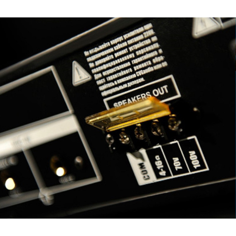 Для подключения спикерной линии в CVGaudio TR-60 используется надежный кабельный терминал под винт. Предусмотрены клеммы для подключение 100V акустических систем, 70V акустических систем и низкоомных 4-16ohm акустическим системам. Обязательным условием является единовременное подключение к усилителю только одного типа акусики.