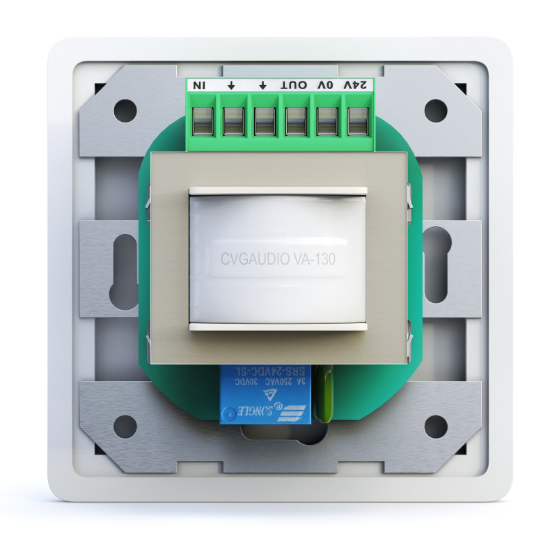 CVGaudio VA-130 имеет стандартный размер лицевой панели и может быть установлен вместе с розетками и включателями освещения стандартного евро размера. Модель совместима с обычными подразетниками и может быть установлена как в гипсокартоновую, так и бетонную или кирпичную стену. Также VA-130 легко устанавливается в стандартный 100мм пластиковый стандартный кабель-канал типа “Legrand”.