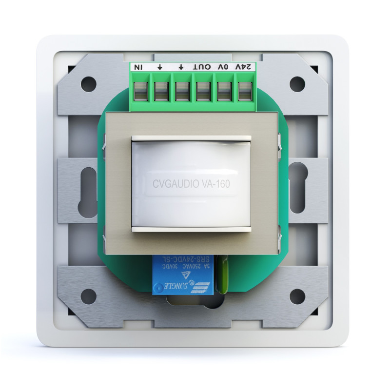 CVGaudio VA-160 имеет стандартный размер лицевой панели и может быть установлен вместе с розетками и включателями освещения стандартного евро размера. Модель совместима с обычными подразетниками и может быть установлена как в гипсокартоновую, так и бетонную или кирпичную стену. Также VA-160 легко устанавливается в стандартный 100мм пластиковый стандартный кабель-канал типа “Legrand”.