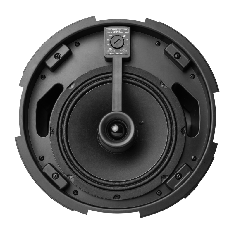 Благодаря прочному стальному корпусу и прочной полипропиленовой передней панели, она обеспечивает конусное покрытие 110°. Разработанная для гибкой адаптации, она оснащена 4-контактным разъёмом Phoenix для удобного подключения входов и выходов. DECO-80-T работает с номинальным импедансом 8 Ом или в линейной системе 100 В, с настройками мощности 15 Вт, 30 Вт и 60 Вт, доступными на передней панели. Благодаря среднеквадратичной мощности 125 Вт, пиковой мощности 500 Вт и максимальному пиковому уровню звукового давления 121 дБ, она обеспечивает мощный и чистый звук.