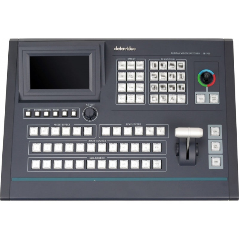 DataVideo SE-900 - это модульный 8-канальный микшер стандартного SD разрешения. Возможности микшера могут быть расширены установкой дополнительных плат и аксессуаров. Микшер состоит из двух блоков: это панель управления и основной блок стандартного размера (19") для установки в рэковую стойку, в который по выбору пользователя можно установить до 8 различных входных плат.