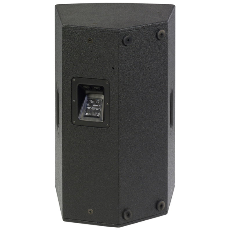 Внутри кабинета dB Technologies ARENA 15 находится НЧ-динамик диаметром 15”, компрессионный ВЧ-драйвер диаметром 1” смонтирован в специально рассчитанном поворотном рупоре с дисперсией 90х40 градусов. Есть и фазоинверторы с выходными отверстиями на передней панели. Частотный диапазон громкоговорителя начинается от 80 Гц, поэтому рекомендуется иметь в паре сабвуфер (например, SW15 и SW18). Входы громкоговорителя выполнены на параллельных разъемах Neutrik speakON NL4.