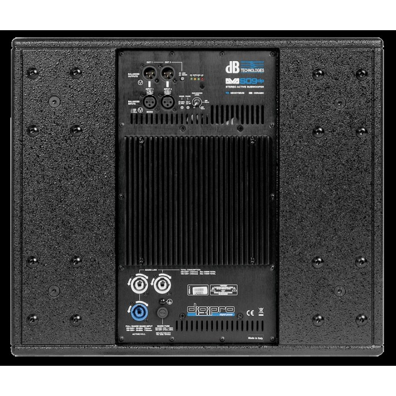 DB Technologies DVA-S09DP – Активный бандпасс сабвуфер с 15-дюймовый вуфером, кроссовером с двумя частотами отсечки (90 и 120 Гц) и переключателем инверсии фазы.