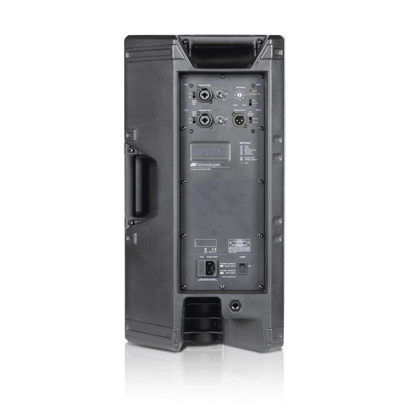 Полипропиленовый кабинет dB Technologies OPERA 10 с внутренней рамой состоит из НЧ-динамика диаметром 10” с двухдюймовой звуковой катушкой и ВЧ-динамика диаметром 1” с компрессионным драйвером для сверхчёткого воспроизведения высоких частот. Дисперсия составляет 85-120х80 градусов, и распространению звука помогает большой асимметричный рупор, в который встроен твитер. Достигается высокая мощность в 600 Вт RMS и 1200 Вт – ¬пиковая; можно услышать многие нюансы, особенно при добавлении в систему сабвуфера. Громкоговоритель оборудован DSP, у которого есть линейные фазовые фильтры с конечной импульсной характеристикой (FIR-фильтры), три лимитера (пиковый, RMS и термический); 8 пресетов эквалайзера, выбираемых ручкой, а также кроссовер с частотой разделения в 2 кГц. Параметры АЦП и ЦАП – 24 бит/48 кГц, внутренняя обработка производится с разрядностью 56 бит.