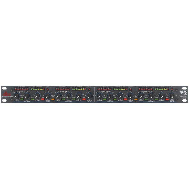DBX 1046 Quad Compressor Limiter спроектирован для того, чтобы давать профессиональное аудио с четырьмя каналами прекрасно звучащей компрессии dbx. Гладкая классическая компрессия dbx “OverEasy” или компрессия “Hard Knee” прекрасно подойдут для использования на индивидуальных дорожках вашего мультитрекового рекордера. Раздельные каналы могут быть индивидуально настроены и использованы для полностью независимых назначений. PeakStopPlus защищает вашу систему от насилующих ее пиков, которые могут нокаутировать вашу портативную акустическую систему или студийные мониторы. Каждый канал имеет “threshold”, компрессию “OverEasy” или “hard knee”, “ratio”, “input/output meter”, “output gain”, “hard-wire bypass”, кнопку “stereo”, объединяющую первый канал со вторым и третий канал с четвертым для получения двух каналов настоящей стерео компрессии, входы и выходы со сбалансированными позолоченными разъемами XLR и разъемами 1/4’’, и переключаемый рабочий уровень. Так что нужно ли вам управлять уровнем, местонахождением в миксе или общими характеристиками четырех независимых сигналов, или контролировать выравнивание гейна на соединенных стереопарах, dbx 1046 Quad Compressor Limiter послужит вам на совесть и все сделает как следует.