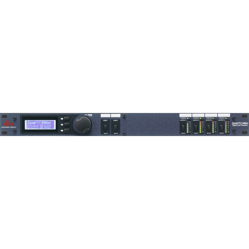 dbx 640m аудио процессор для многозонных систем. 6 входов - 4 балансных мик/лин Phoenix, 2 RCA; 4 балансных Phoenix выхода, управление - ЖК дисплей на лицевой паннели, GUI интерфейс - с компьютера. 2 порта для подключения контроллеров ZC (до 12 шт)