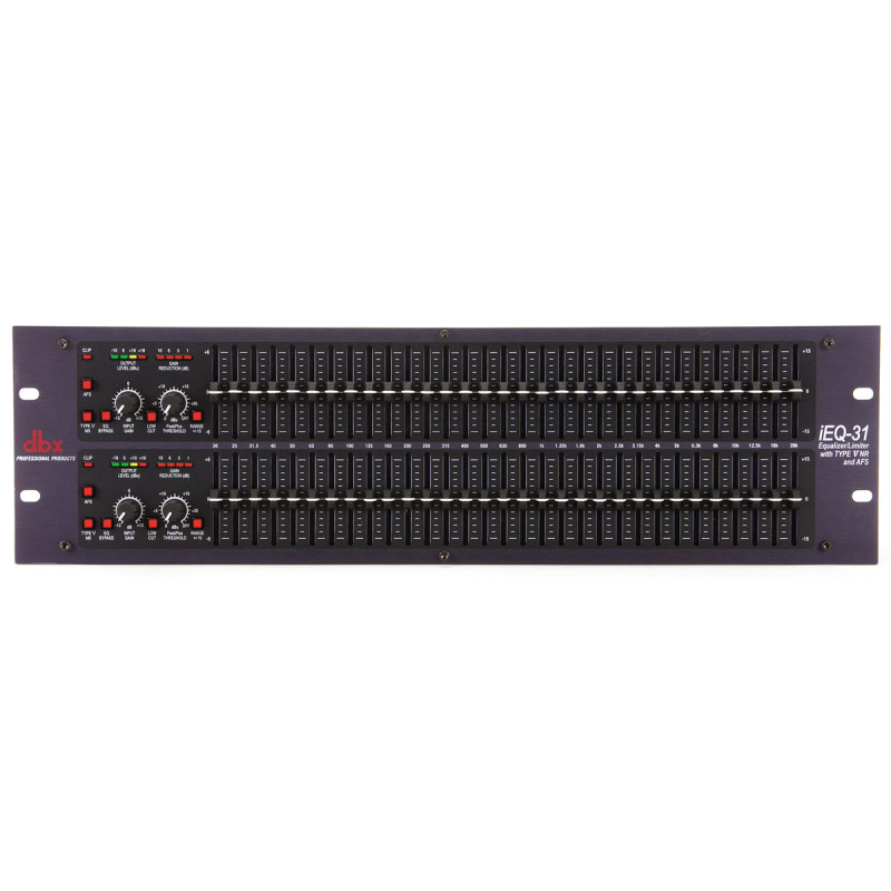 Двуканальный 31-полосный эквалайзер оборудован цифровой автоматической системой подавления акустической обратной связи AFS. Семейство эквалайзеров dbx серии iEQ, заменившей собой легендарную в прошлом серию 30 отличается также наличием наиболее эффективно показавших себя регулируемых патентованных лимитеров PeakStopPlus в каждом канале и новой системой шумоподавления Type V на основе динамического фильтра, существенно снижающей шумы даже при экстремальных положениях движков. Динамический диапазон прибора - более 113 дБ (на A-взвешенном сигнале) при суммарных искажениях менее 0,003%. Предусмотрены отключаемые обрезные НЧ-фильтры, релейный режим обхода и изменяемый диапазон регулировок в каждой полосе (±6 дБ/ ±15 дБ). Симметричные входы и выходы (XLR, 6.3 мм phono jack и разъемы Euroblock).
