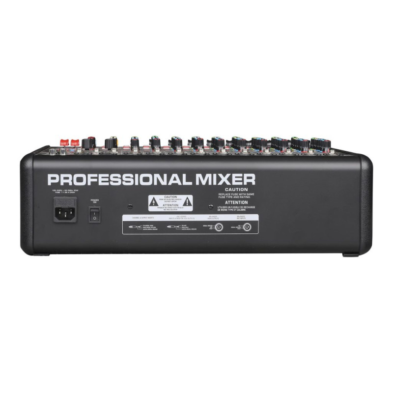 Он предлагает 10 микрофонных балансных входов XLR/разъемы INSERT, а также 3 стереопары с разъемами RCA. Эквалайзер с 3-х полосной настройкой и возможностью перестройки середины позволяет точно настроить звучание. Пульт оснащен 2 групповыми шинами (GROUP) и 2 AUX шинами, включая FX. Наличие HPF фильтра на моноканалах и встроенных компрессоров обеспечивает более чистый и управляемый звук