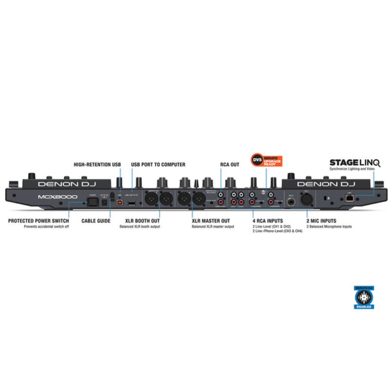 Denon MC7000 DJ контроллер.Профессиональный DJ контроллер Denon MC7000 предназначен для работы с софтом Serato DJ, а главной её особенностью является наличие двух встроенных 24-битных звуковых USB-интерфейсов, что позволяет подключать к контроллеру сразу два ноутбука и играть в режиме back-2-back или без пауз переходить от сетов одного диджея к другому. Также MC7000 имеет в своём «арсенале» прочные 133-миллиметровые джоги, сенсорные полосы Needle Drop, шестнадцать пэдов с RGB-подсветкой и автономный 4-канальный микшер, заимствованные у флагманской модели MCX8000.