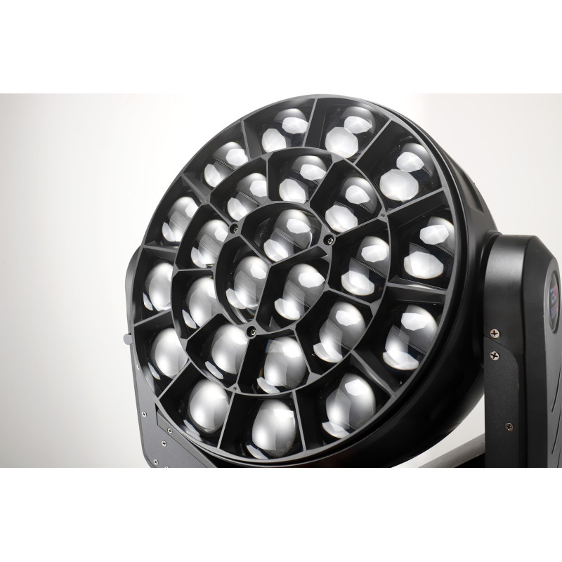 Технические характеристики включают возможность зумирования от 3,5° до 45°, 24 светодиодов RGBW по 60 Вт каждый, попиксельное управление диодами, различные режимы управления (DMX512, звуковая активация, автоматический режим, master/slave) для удобного контроля освещением в любых условиях. Передняя линза имеет возможность непрерывного вращения, создавая эффект B-eye для дополнительной динамики и креативности в освещении.