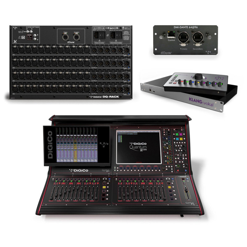В составе новейшая консоль Quantum 225 с интерфейсным модулем DQ-Rack и интерфейсом Dante на борту. А также процессор для создания 3D-мониторных миксов KLANG:Vokal и шесть физических персональных контроллеров KLANG:Kontroller со встроенными наушниковыми усилителями.
