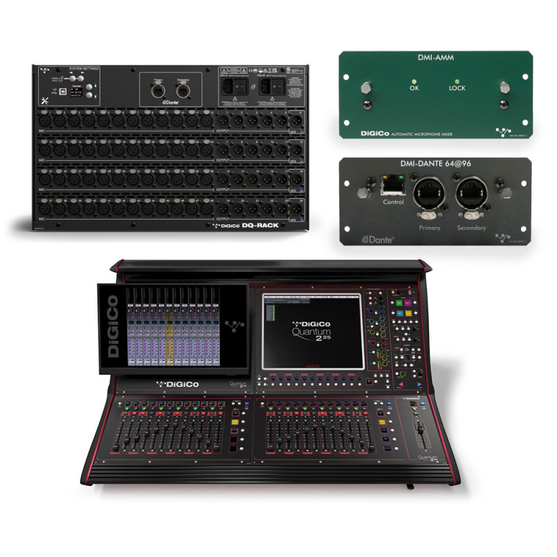 В составе новейшая консоль Quantum 225 и интерфейсный модуль DQ-Rack c интерфейсом Dante на борту. Это дает широкие возможности по интеграции системы в существующую сетевую инфраструктуру объектов, а также по сопряжению в одном проекте оборудования разных производителей. DMI-карта AMM, которая позволяет добавить в консоль модуль автомикшера до 48 каналов. Автомикшер упрощает проведение речевых мероприятий с большим количеством микрофонов: неактивные микрофоны автоматически закрываются.
