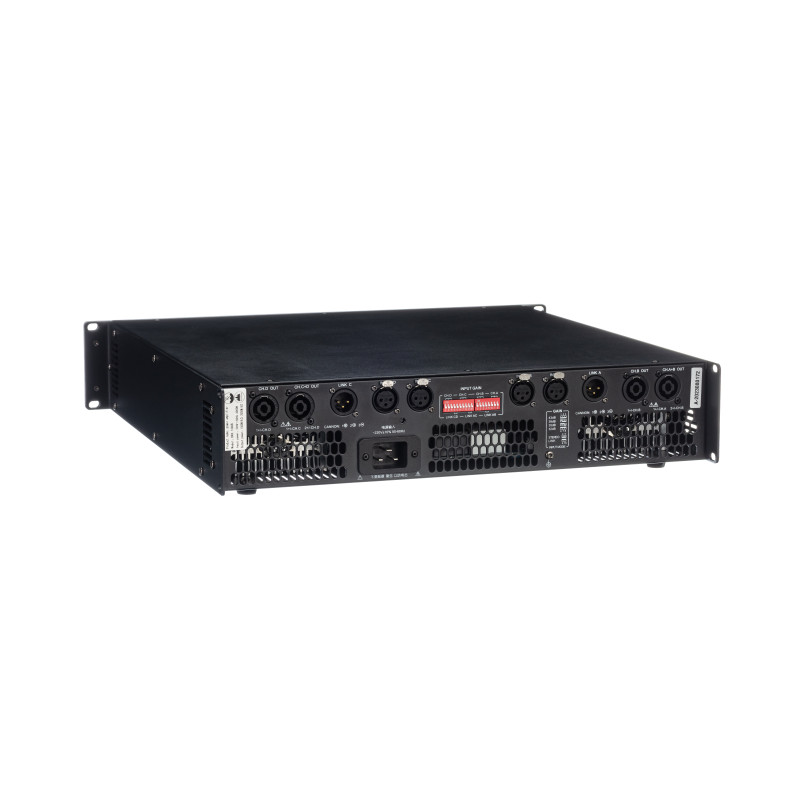 Соотношение сигнал/шум (SNR) превышает 100 дБ (A-weighted), а демпинг-фактор составляет более 300. Искажения THD+N на уровне < 0.03 % при частотах 20 Гц – 20 кГц и мощности 1 Вт. Усилитель оснащен 4 разъемами XLR F для аналоговых подключений и 4 разъемами Speakon для подключения акустических систем.