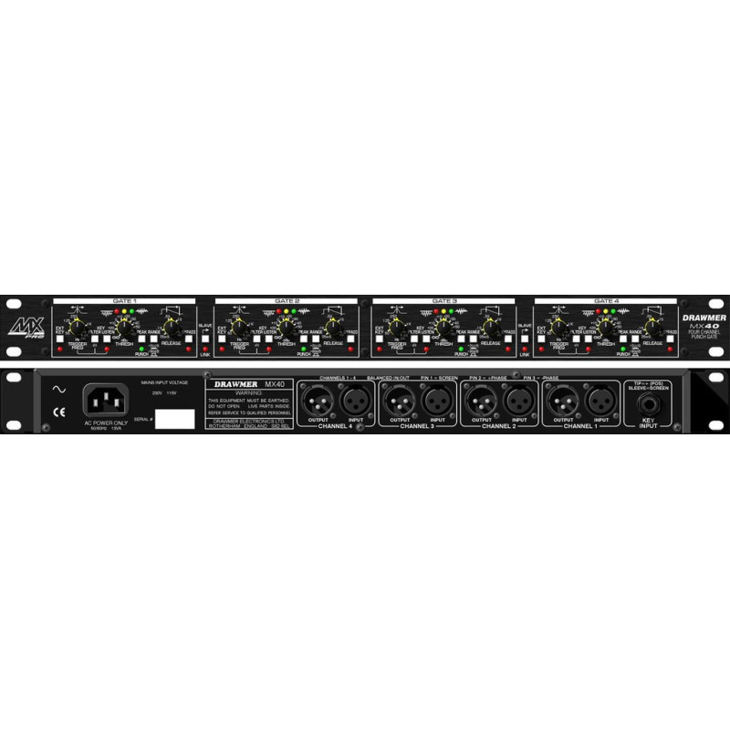 MX40PRO - первый продукт компании Drawmer, который включает в себя собственную запатентованную компанией схему «Peak Punch» , которая придает уникальное динамическое усиление атаке перкуссионного материала, придавая исполнению настоящий "ударный" эффект. Кроме того, MX40PRO включает в себя систему "Frequency Conscious System", разработанную компанией Drawmer (впервые эта система использовалась при создании сдвоенного ударного гейта DS201 Dual Gate). Drawmer MX40PRO объединяет четыре канала гейта в единый блок с регуляторами и индикаторами, позволяющими значительно упростить и ускорить установку и настройку.