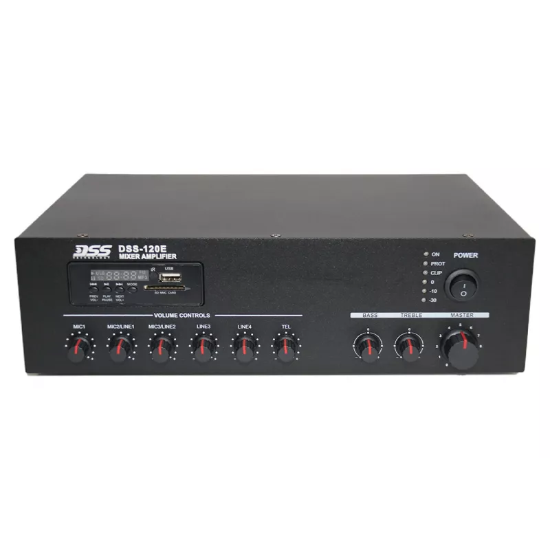 DSS-120E усилитель предназначен для обеспечения звуковой трансляции, оповещения и фоновой музыки для таких объектов, как школы, торговые центры, гостиницы и т.д. Он может работать как в низкоомном режиме (8–16 Ом), так и в высоковольтном (70/100 В). Усилитель оснащен встроенным микшером с тремя микрофонными входами и двумя линейными.