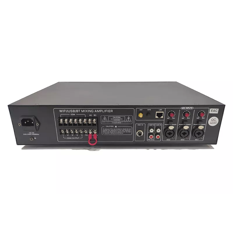 Трансляционный микшер-усилитель, 120 Вт, входы: 3 микрофонных/линейных + 2 Aux, WIFI, MP3, SD, Bluetooth, режимы 70 В/100 В/4–16 Ом, DSS