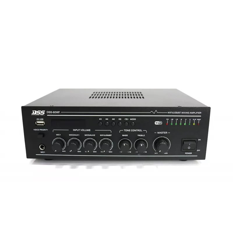 DSS-60WF усилитель предназначен для обеспечения звуковой трансляции, оповещения и фоновой музыки для таких объектов, как школы, торговые центры, гостиницы и т.д. Он может работать как в низкоомном режиме (8–16 Ом), так и в высоковольтном (70/100 В). Усилитель оснащен встроенным микшером с тремя микрофонными входами и двумя линейными.
