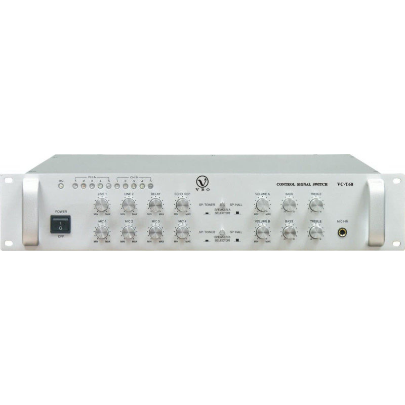 DSS VC-T60 трансляционный усилитель-микшер, 2х60 Вт, 2 зоны, 6 входов (4 х микрофон, 2 х линия), 70-100В/4-16 Ом, процессор эфектов, высота 2 U, VBO