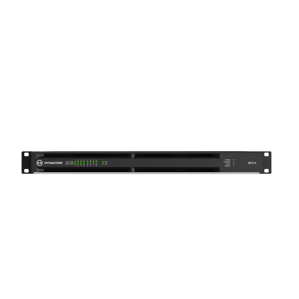 The IX60:8 is an 8-channel networked DSP amplifier with 6 kW total output power. Capable of driving Hi-Z or Lo-Z loads with powerTANK technology, the IX60:8 is ideal for a wide range of applications including sports venues, houses of worship, live performance spaces and hospitality.