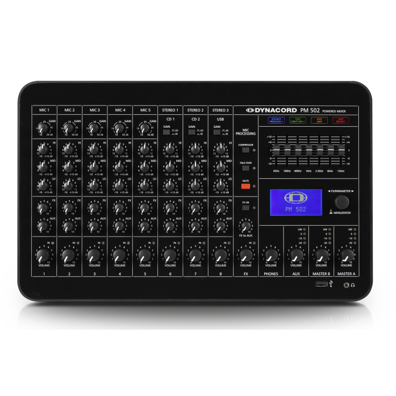 Dynacord PM 502 Активный микшерный пульт. 5 XLR микрофонных входов/3 TRS стерео входа. 2x450W 4Ohm. 100V выход. MP3 плеер. 395x244x241 мм. 4,9 кг