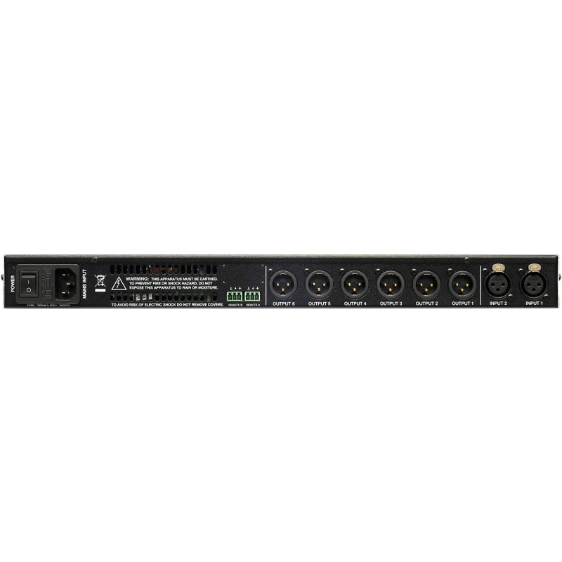 Задержки, 8-канальные графические эквалайзеры, фильтры, компрессоры на каждый вход. 2 линейных входа (XLR), 6 выходов (XLR).