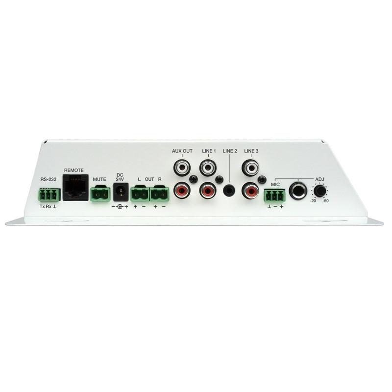 Режим энергосбережения, питание 24 В от внешнего блока питания. Три линейных небалансных входа, комбинированный Mic/Line вход с настраиваемым приоритетом, mute. Управляется по ИК, RS-232 и с панелей WPm.