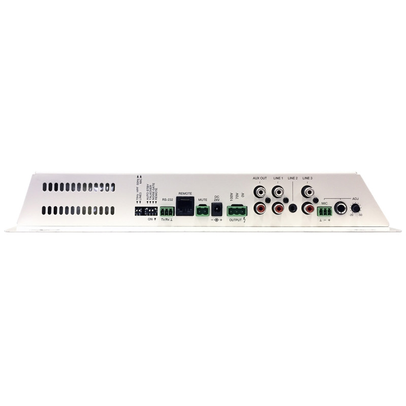 Режим энергосбережения, питание 24 В от внешнего блока питания. Два линейных небалансных входа, комбинированный Mic/Line вход с настраиваемым приоритетом, mute. Управляется по ИК, RS-232 и с панелей WPm.