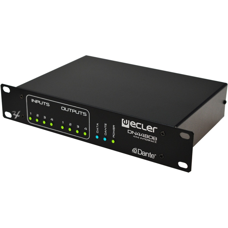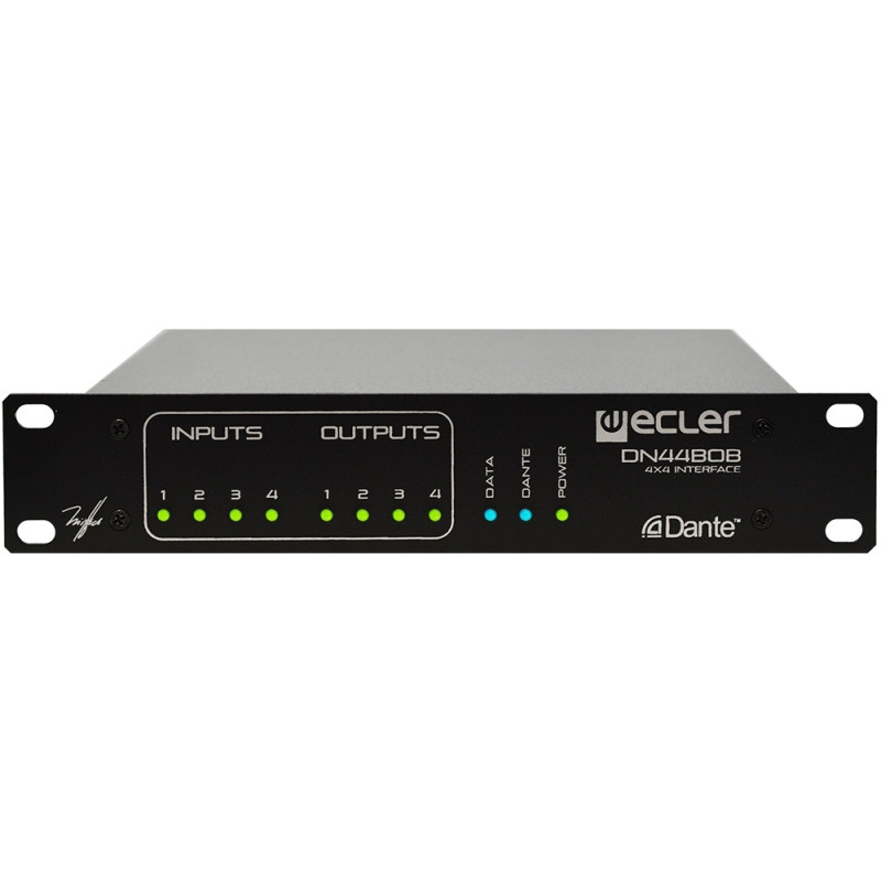 Ecler DN44BOB – Цифровая матрица аудиосигналов, транскодер аналоговых аудиосигналов (линейного и микрофонного уровней) и сигналов интерфейса Dante. 4 входа и 4 выхода балансного сигнала, 1 порт сети Ethernet / Dante.