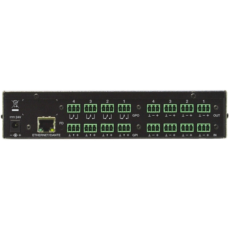 Преобразует входные аналоговые сигналы микрофонного или линейного уровня для передачи их по витой паре с использованием технологии Dante, либо наоборот – принимает до 4 каналов из сети Dante и преобразует их в балансное аудио линейного уровня. Устройство позволяет включить фантомное питание микрофонов 18 В. Управление по IP, питание от блока питания. В комплект входит адаптер для установки в стойку.