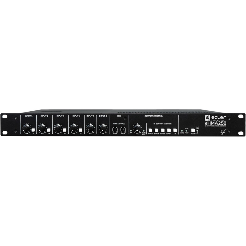 Ecler eHMA250 – Усилитель мощности на 4 зоны 250 Вт для трансляционной линии 50/70/100 В или с подключением по 4/8 Ом.