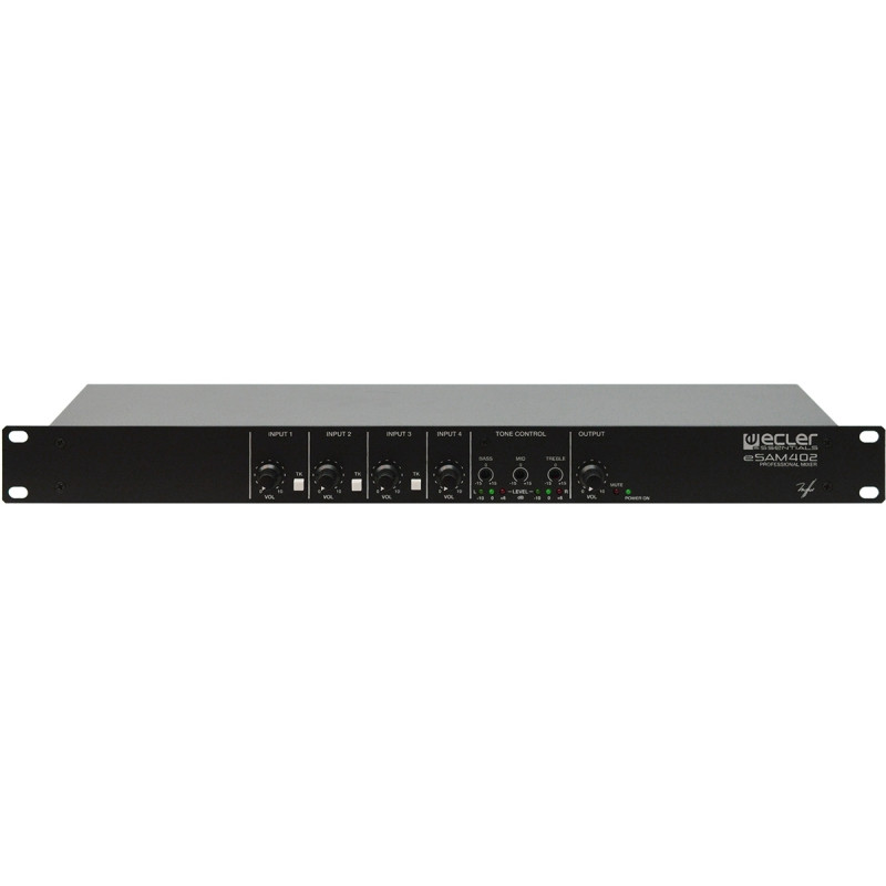 Ecler eSAM402 – Четырехканальный коммутатор/микшер с тремя входами балансного микрофонного / линейного сигнала с фантомным питанием 18 В, одним небалансным стереовходом, с эквализацией.