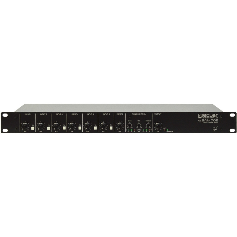 Ecler eSAM702 – Семиканальный коммутатор/микшер с шестью входами балансного микрофонного / линейного сигнала с фантомным питанием 18 В, одним небалансным стереовходом, с эквализацией.