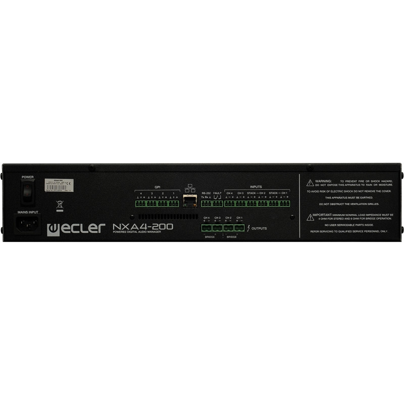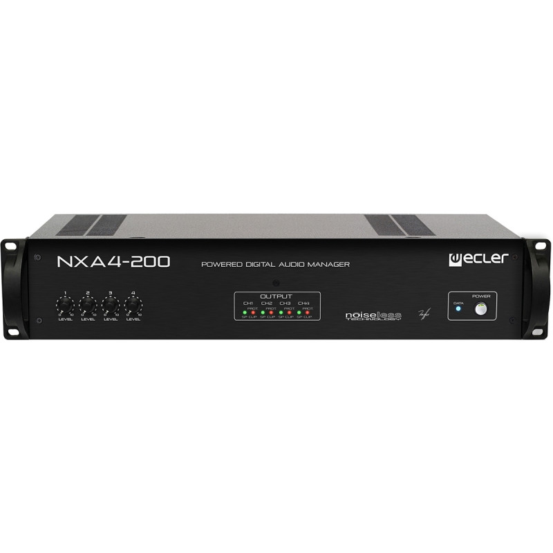 Ecler NXA 4-200 – Микшер-усилитель D класса с DSP-процессором и балансными входами по 200 Вт RMS на канал (4 Ом), а также 4x168 Вт – 4 Ом, 2x383 Вт – 8 Ом.
