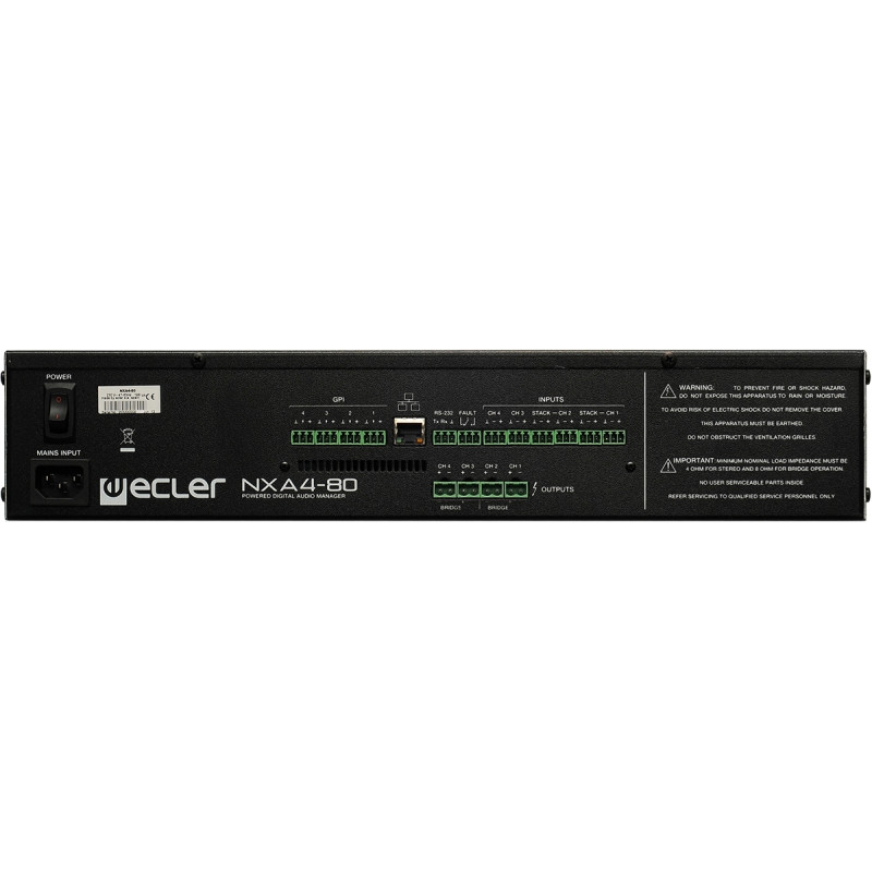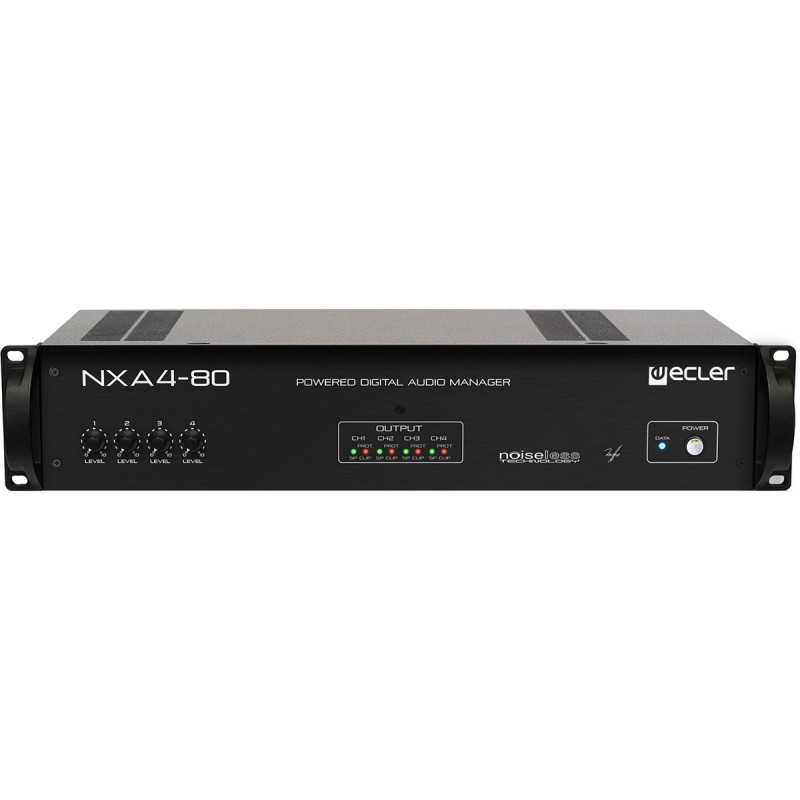 Ecler NXA 4-80 – Микшер-усилитель D класса с DSP-процессором и балансными входами по 80 Вт RMS на канал (4 Ом), а также 4x66 Вт – 4 Ом, 2x160 Вт – 8 Ом.