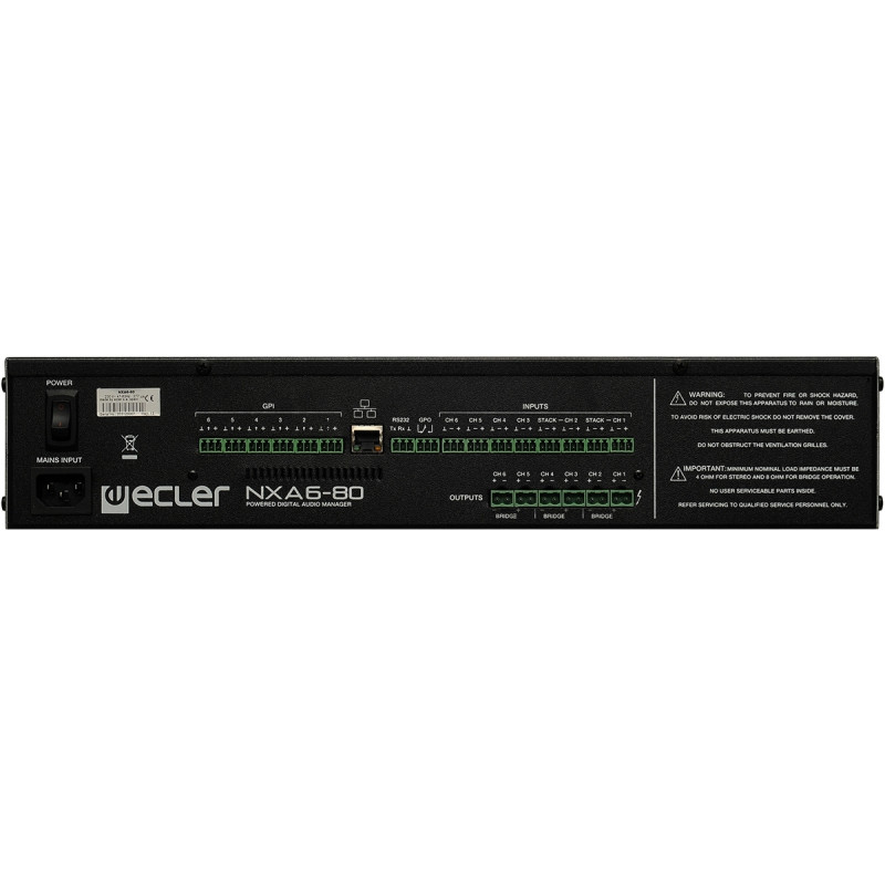 Ecler NXA 6-80 – Микшер-усилитель D класса с DSP-процессором и балансными входами по 80 Вт RMS на канал (4 Ом), а также 6x65 Вт – 4 Ом, 3x158 Вт – 8 Ом.