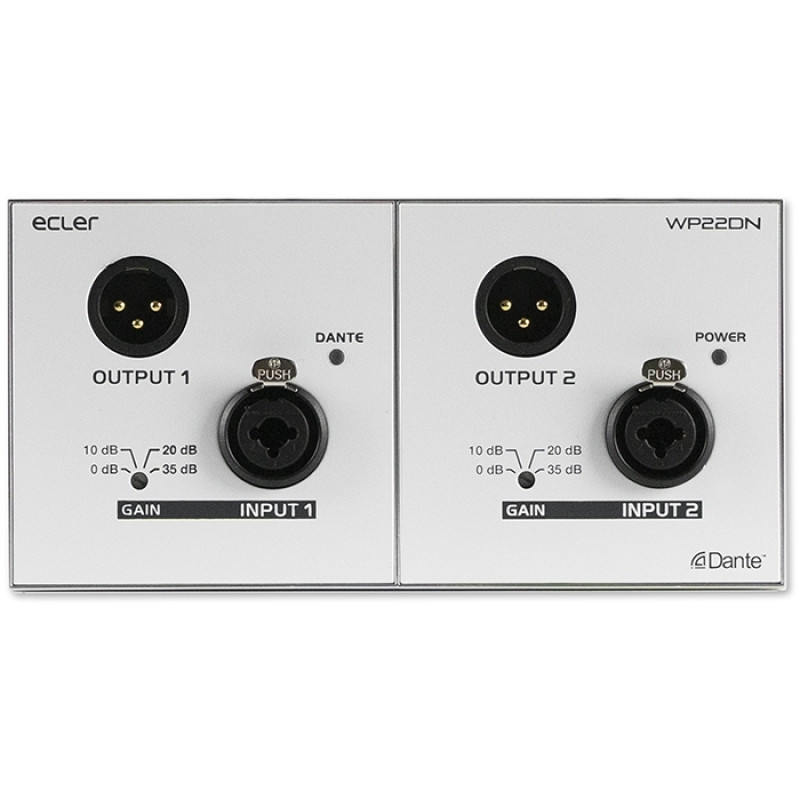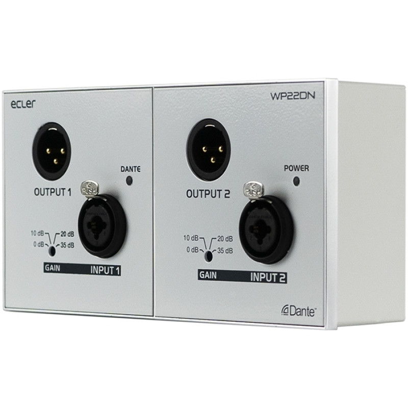 Ecler WP22DN – Транскодер аналоговых аудиосигналов и сигналов интерфейса Dante. 2 входа и 2 выхода балансного сигнала, 1 порт сети Dante.