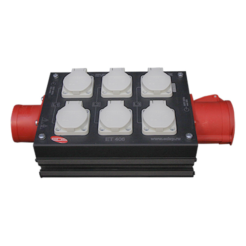 Осуществляет коммутацию от входного разъема PCE CEE32A 5-pol. IP44 до встраиваемых розеток PCE Schuko 16A по две на каждую фазу, а также сквозная коммутация до выходной розетки PCE CEE32A 5-pol. IP44.