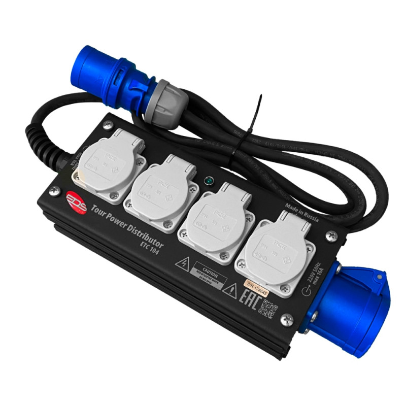 Коммутация: питание осуществляется через силовую вилку CEE16A 3-pol. на 2х-метровом кабеле H07RN-F 3G2,5 (длина кабеля может быть изменена под индивидуальный размер), выход через 4 розетки Schuko16A с заземлением и защитными крышками и силовую розетку РСЕ СЕЕ 16А 3-роI.