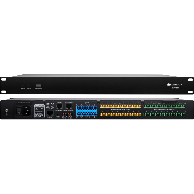 Elarcon ELD 1616 — универсальный процессор цифровых сигналов на основе архитектуры A -DSP, производительностью до 400 MIPS, 1600 MFLOPS, с фиксированными 16 аналоговыми входами и 16 аналоговыми выходами, Dante 16×16 и встроенным аудиоканалом USB, который может обрабатывать как аналоговые, так и цифровые сигналы.